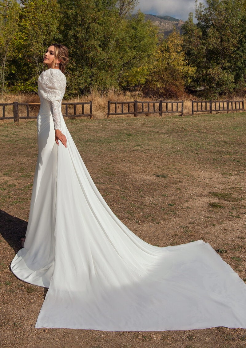 Este vestido de novia asimétrico es la opción perfecta para la novia que busca un look moderno y elegante. Con una sola manga larga de encaje y un corte limpio que resalta la figura, es ideal para bodas sofisticadas y contemporáneas. La abertura en la falda añade un toque de sensualidad, permitiendo que la novia muestre sus piernas con estilo. La larga cola proporciona un contraste dramático, aportando un aire de glamour al conjunto. Este vestido está diseñado para novias que desean una combinación de elegancia clásica con un toque audaz y moderno en su gran día, destacando por su originalidad y elegancia.