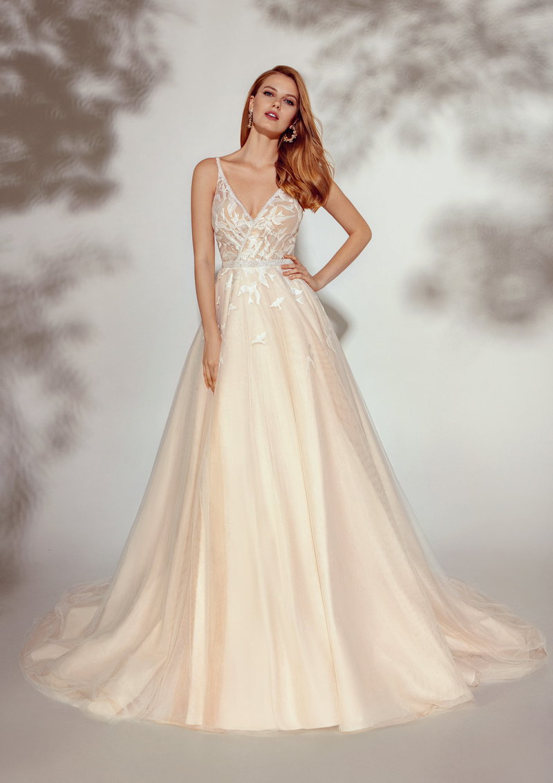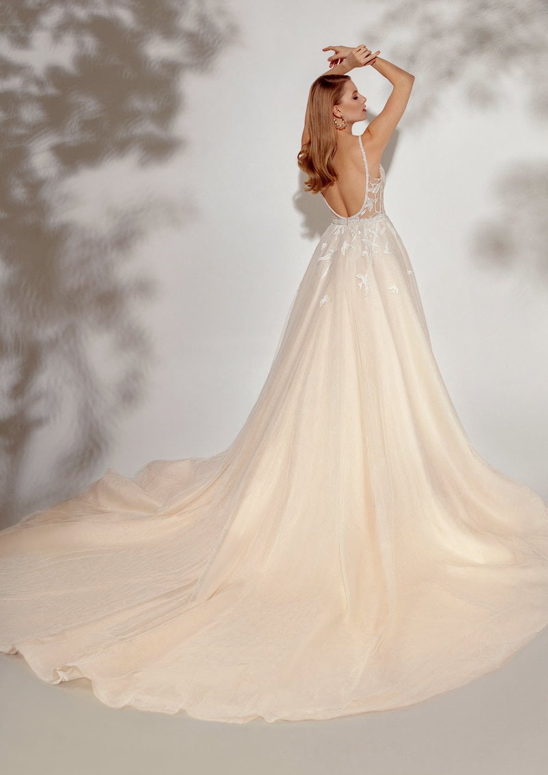 Suaves y fluidos tules te acompañan y se mueven contigo en este etéreo vestido de capas de tul en tonos marfil y melocotón. Su corte princesa destaca tu cintura y talle, resalta tus hombros y ensalza tu espalda con su interminable escote. El corpiño ajustado con transparencias y bordados en relieve realza la feminidad de la novia, creando una silueta elegante y refinada. Los pequeños bordados de pajarillos en hilo y cristal le dan el toque romántico, inconfundible de María Salas.