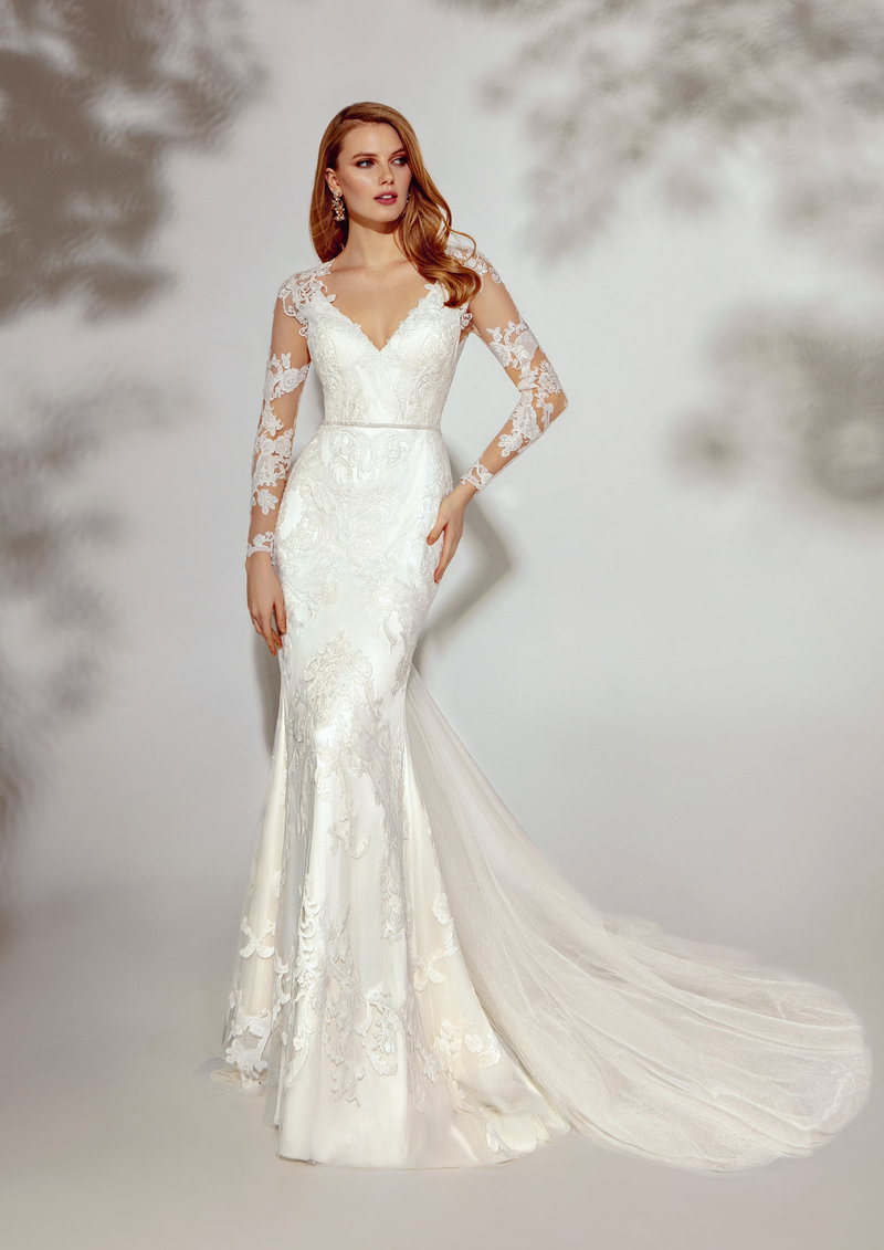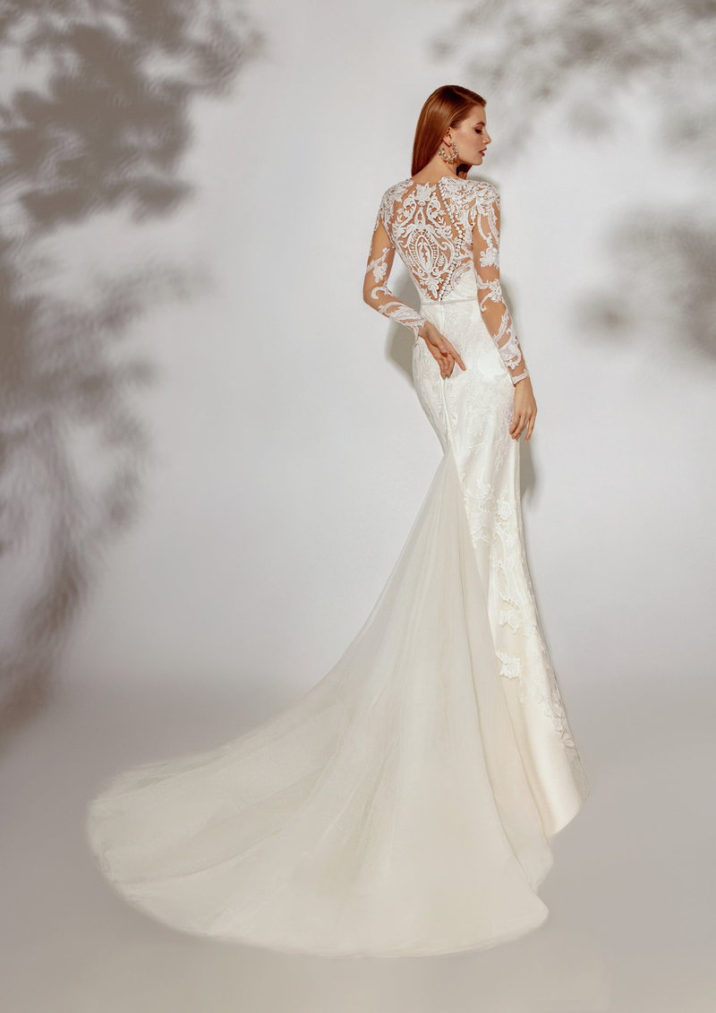 Este vestido combina la sensualidad del encaje con un diseño contemporáneo y atrevido. Sus mangas transparentes y trabajadas en encaje floral estilizan los brazos, mientras que el escote en V profundo enmarca el busto con elegancia. La espalda, un espectáculo de elaborados bordados, revela sutilmente la piel, creando un contraste perfecto entre lo romántico y lo moderno. La falda se ajusta a la silueta antes de abrirse en una delicada cola de tul que fluye con suavidad, perfecta para una novia que busca impactar sin renunciar a la feminidad. Ideal para quienes desean una mezcla de audacia y sofisticación en su día especial.