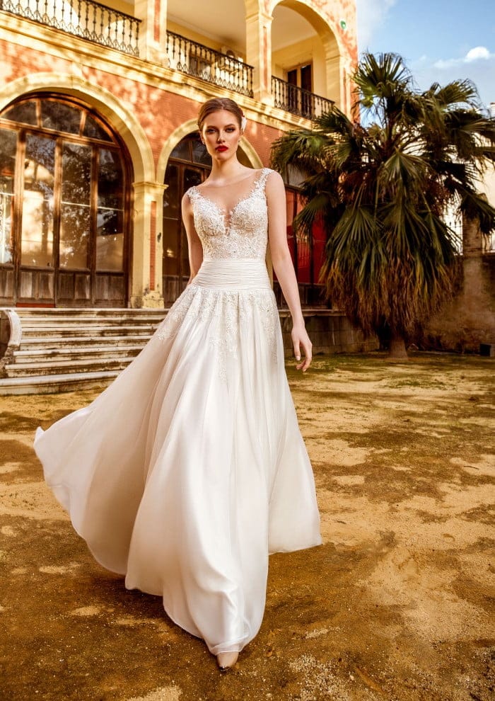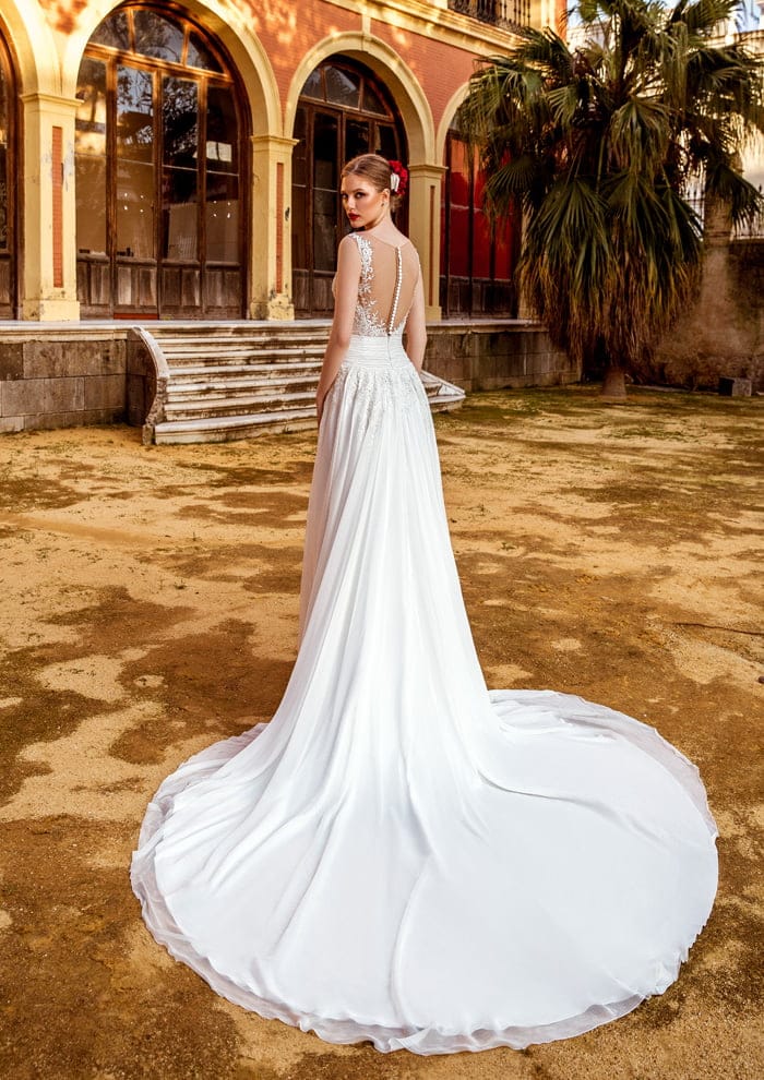 Águilas es un sueño hecho realidad para la novia que busca la combinación perfecta entre elegancia y ligereza. Con un corpiño delicadamente bordado que resalta la figura, este diseño fluido cae en una falda de gasa que se mueve con gracia a cada paso. Ideal para una boda al aire libre, en un jardín o junto al mar, donde el viento pueda jugar con la tela y añadir un toque mágico. La novia que elige este vestido es romántica, de espíritu libre y con un amor por los detalles sutiles pero impactantes. Un diseño que promete hacer que la novia brille en su gran día.