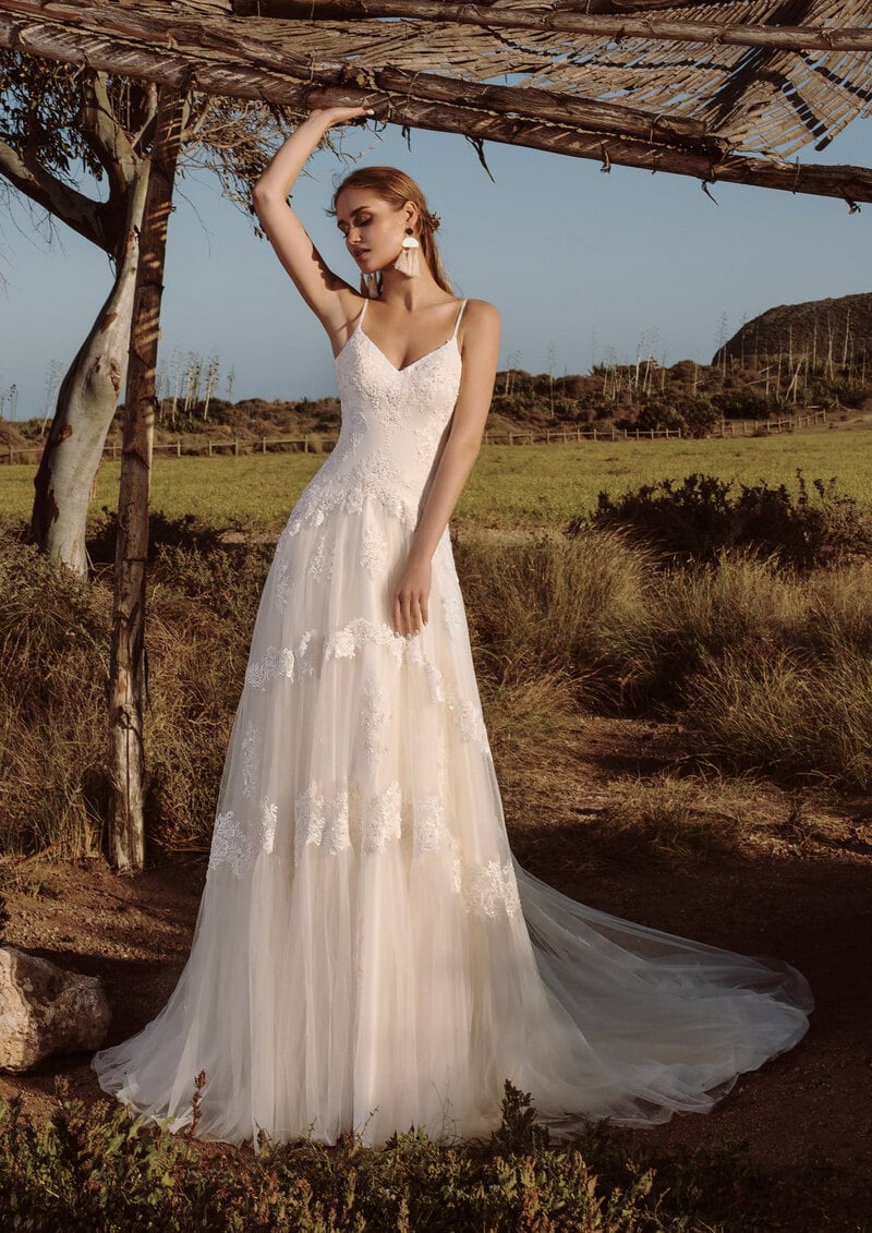 La joya de la colección Magia es el espectacular modelo Albicante, un diseño de corte retro, sublime y maravilloso, con una caída y movimiento muy naturales y desenfadados, combinado con los materiales más extraordinarios. Ligero y lleno de romanticismo, este vestido es perfecto para una novia que desea sentir la libertad del viento en su piel mientras camina hacia el mejor capítulo de su vida. Con delicados tirantes y una falda de tul que fluye en varias capas, este diseño realza la feminidad de manera sutil. Ideal para bodas al aire libre, este vestido refleja el espíritu de una novia que valora la simplicidad elegante.