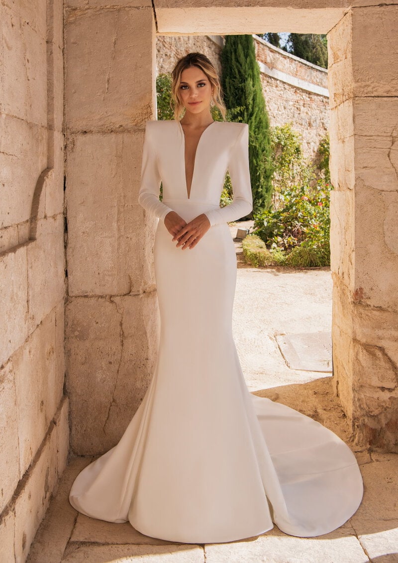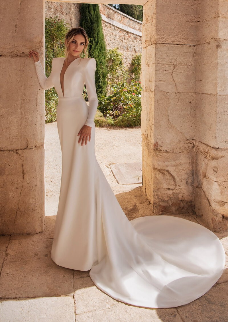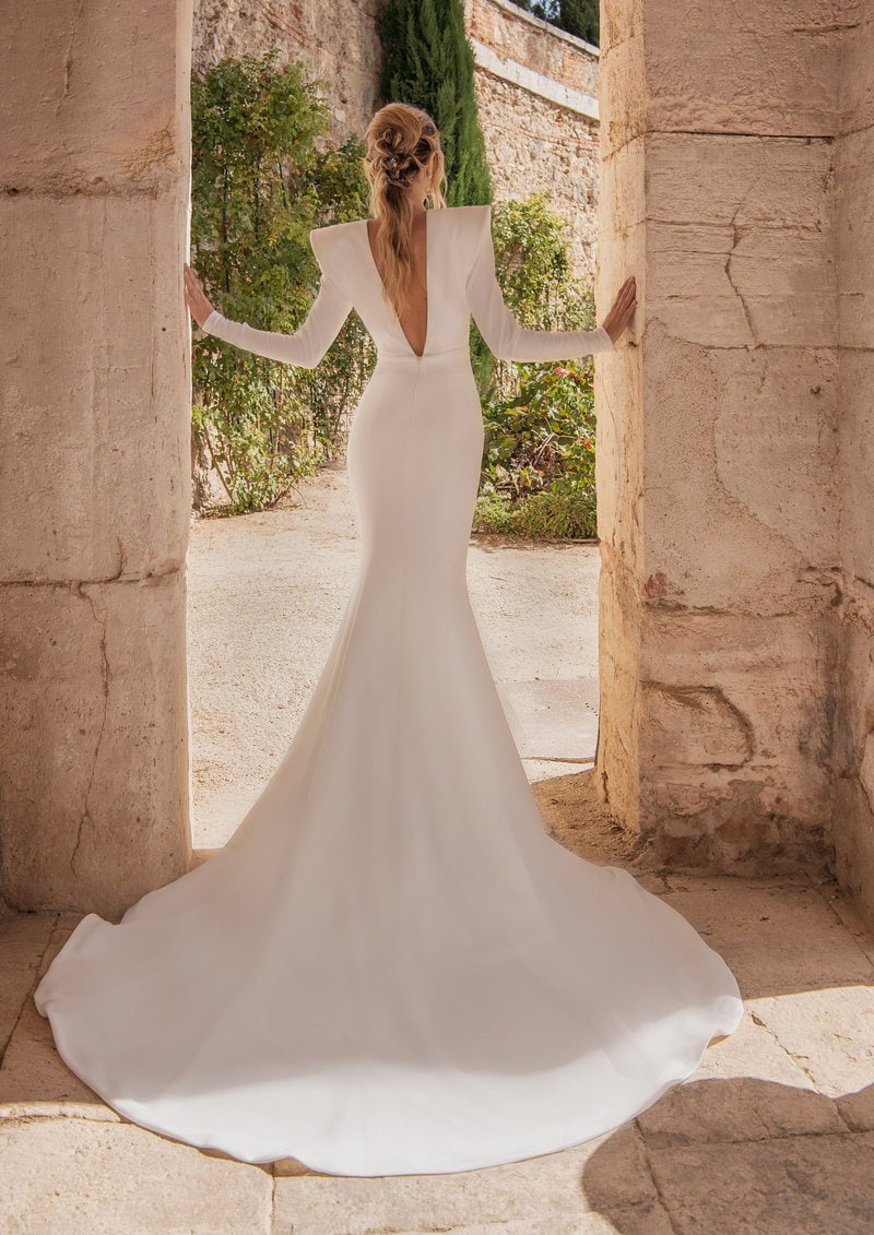 Este impresionante vestido de novia de corte sirena con maxi hombreras y escotes profundos es ideal para la novia que busca un look moderno y sofisticado. Las mangas largas y los hombros estructurados añaden un toque de elegancia y vanguardia. Perfecto para bodas en interiores o en lugares históricos, donde el ambiente complementa su diseño audaz. La espalda abierta en forma de V acentúa la figura con gracia y sensualidad. La imponente cola aporta un aire de majestuosidad. Este vestido es la elección perfecta para la novia que desea destacar con un estilo contemporáneo y elegante en su día especial, creando una impresión duradera.