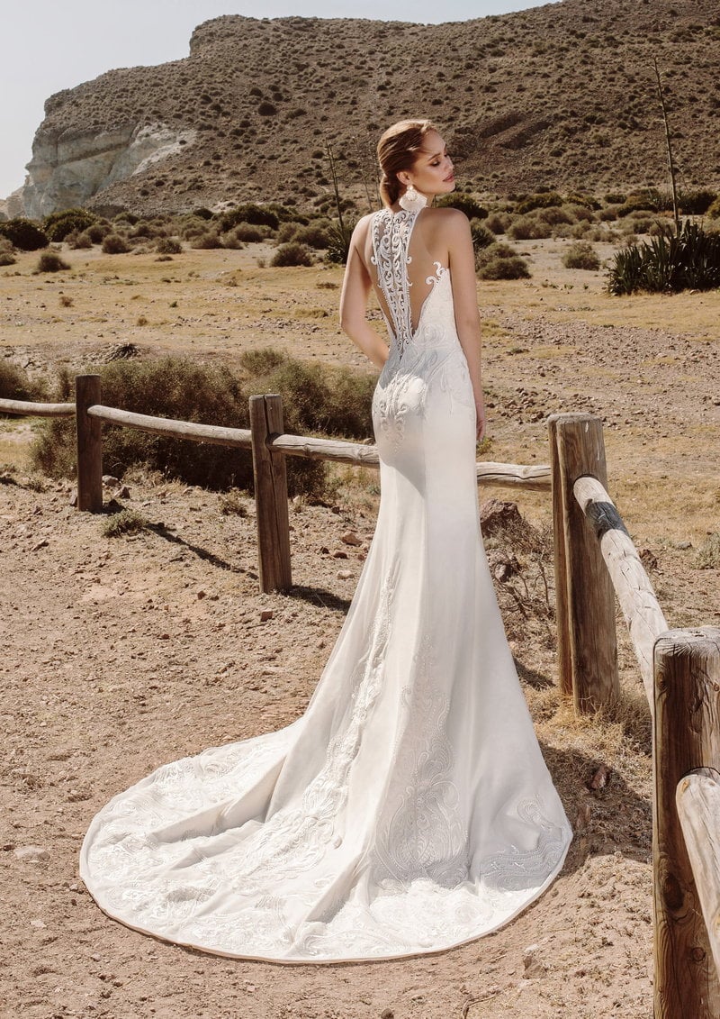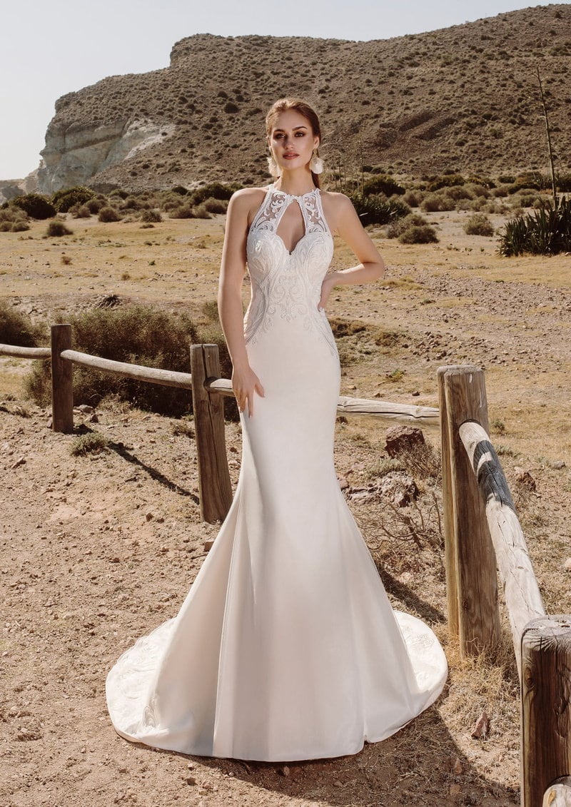 Rompiendo con lo convencional, este vestido de corte sirena es para la novia que busca una mezcla de sofisticación y modernidad. Confeccionado en un delicado encaje, su escote halter con detalles transparentes añade un toque de sensualidad. Su majestuosa y alucinante espalda abierta crea una silueta etérea que termina en una cola fluida, perfecta para un ambiente al aire libre o un escenario bohemio. Ideal para novias seguras de sí mismas que desean resaltar su figura con elegancia sin renunciar a la comodidad. Cada detalle ha sido pensado para crear un look inolvidable en su gran día.