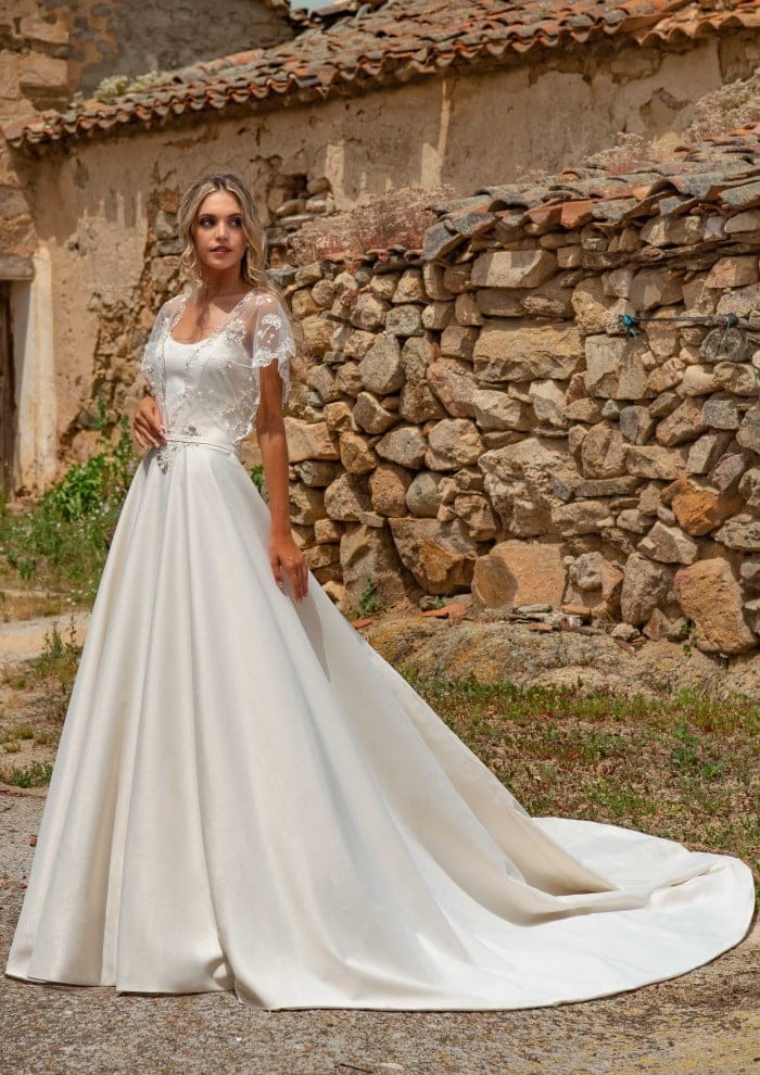 Un vestido que captura la elegancia de una novia clásica, pero con un toque moderno. La delicadeza de su corpiño se mezcla a la perfección con la suavidad de una falda de piqué metalizado que cae en una larga y majestuosa cola. Las mangas, bordadas con delicados dientes de león, aportan un aire romántico, ideal para una novia que busca un equilibrio entre lo tradicional y lo actual. Perfecto para aquellas que sueñan con caminar hacia el altar envueltas en una atmósfera de pura magia y sofisticación. Este diseño hará que cualquier novia se sienta única, radiante y atemporal.