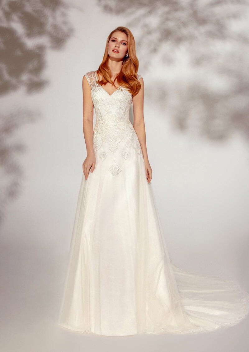Para aquellas novias que deseen un vestido moderno y actual, sin añadir volumen a su silueta, proponemos el modelo Aroma de la Colección Essence. Un delicado vestido de tul con talle bajo. tirante ancho y un sutil corte A, bordado con motivos geométricos y detalles de pedrería. Añadiendo que los escotes en V en delantero y espalda estilizan tu figura, Aroma es perfecto para cualquier mujer y talla.