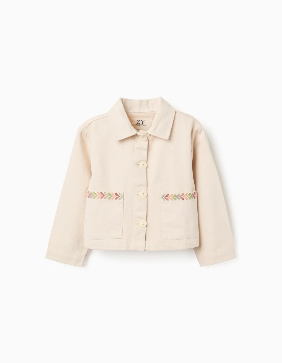 Esta chaqueta de sarga beige claro para niña es la opción perfecta para mañanas frescas. La tela ligera y transpirable garantiza libertad de movimiento y comodidad en cualquier ocasión.