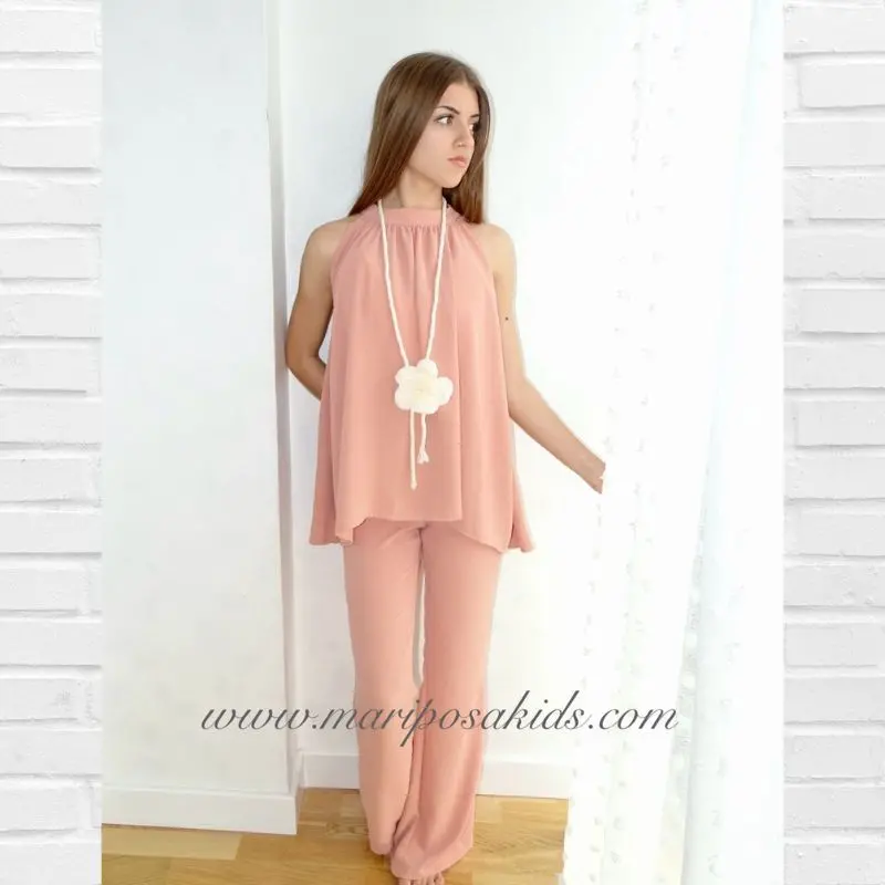 EVE CHILDREN Colección Primavera/Verano 2026 , conjunto de blusa y pantalón ligeramente acampanado en color rosa empolvado, la blusa atada al cuello con hombros despejados con un patrón en cola en la parte trasera.. Forro interior.
