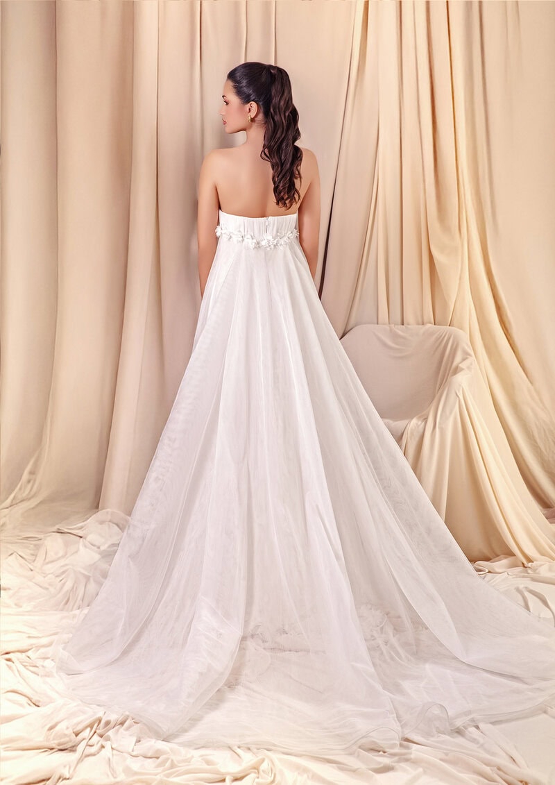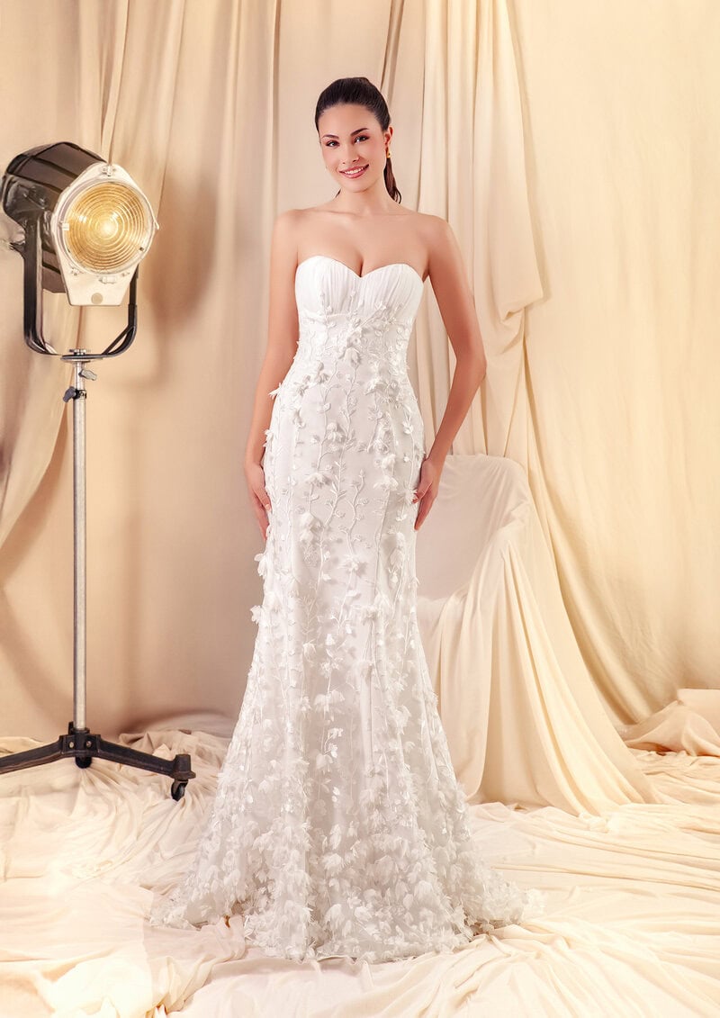 Elegante, firme y con un magnetismo sereno. Lauren, inspirado en la inconfundible Lauren Bacall, combina sofisticación y carácter en un diseño pensado para dejar huella. Su escote palabra de honor enmarca los hombros con delicadeza, mientras la cola desmontable transforma el vestido, adaptándose a cada momento del día. La silueta de sirena y el tul bordado con pequeñas flores en 3D aportan una presencia rotunda sin necesidad de excesos. Para novias que pisan con seguridad, que no buscan llamar la atención, pero lo consiguen. Un diseño que habla claro, con voz propia.