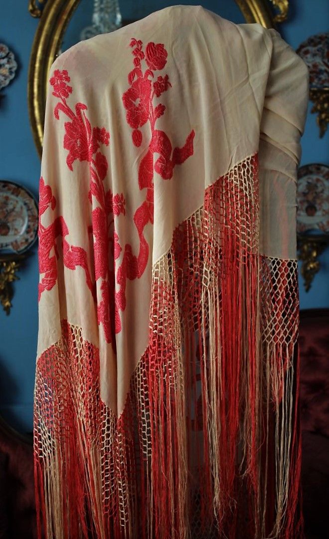 Mantón del primer tercio del Siglo XX (1920) , de época Art. Decó, bordado en seda color marfil semitransparente, con flores, hojas y ramas. El color es rojo-rosáceo. En las cuatros esquinas de la seda un ramillete de flores con lazadas por todo el borde mismo.