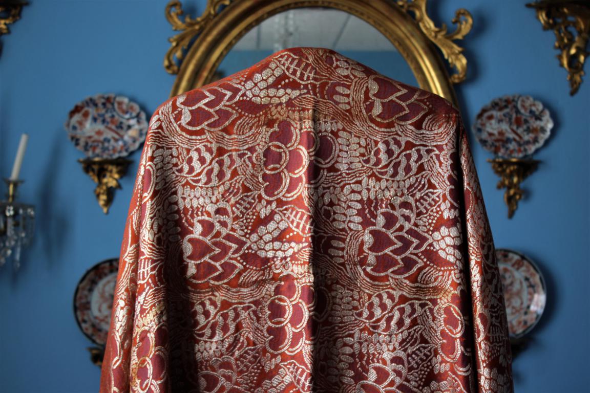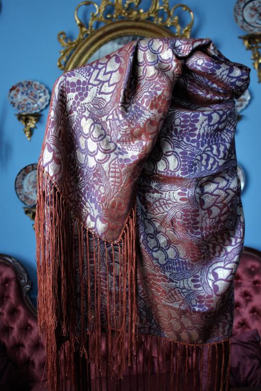 Espectacular mantón/chal Art Deco de los años 20 (1925) en seda color caldera con reflejos dorados, malvas, naranjas y azules. Con diseño geométrico de hojas y flores, estando la seda y el lamé (laminas) en perfecto estado de conservación, sin que el paso de los años hubiese oscurecidos el dorado.