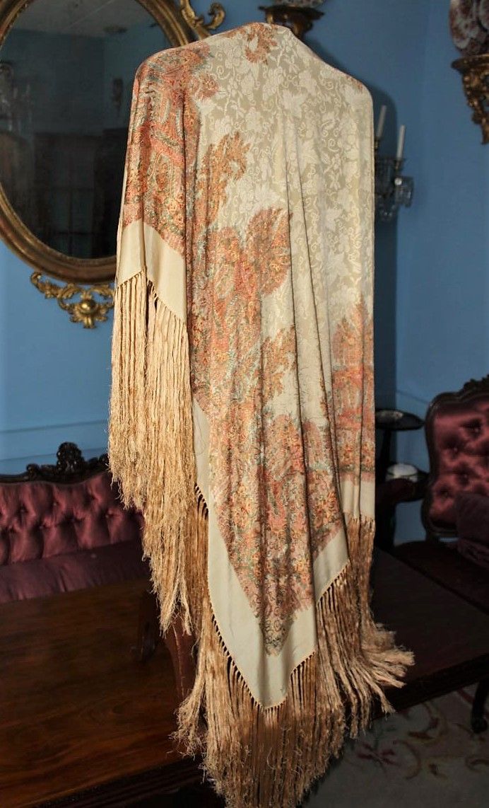 Espectacular Manton Chal de la primera mitad del siglo XX (1930/1940), realizado en telar a mano sobre seda color champan y dibujos de paisley en todos ocres, marrones y naranja.