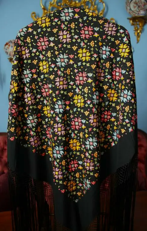 Espectacular Mantón de principios del Siglo XX, de los años 20/30, bordado en seda totalmente a mano en fondo color negro.