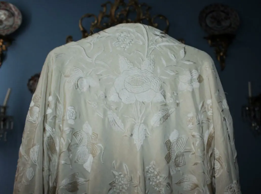 Los flecos cortos y el macramé o enrejado pequeño, tal y como se enflecaban los primeros mantones de esa época, ya que a merced que avanzaba el sigoo XIX, los flecos y el enrejado eran mayor y mas largos, lo que indica su antiguedad. Todo realizado a mano por expertos artesanos de la escuela cantonesa.