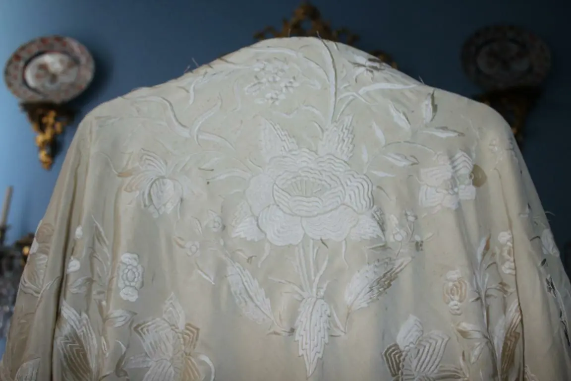 Mantón de Manila de cuartores, de la época Imperio, de los llamados de cuarterones, del segundo tercio del siglo XIX, bordado en seda fria de color blanco roto. El bordado efectuado en hebra de seda muy fina beige, lo que le hace un bordado especial, con puntada corta y apretada, no distinfiendose el derecho del reves, y haciendo juego de sombras a la luz.