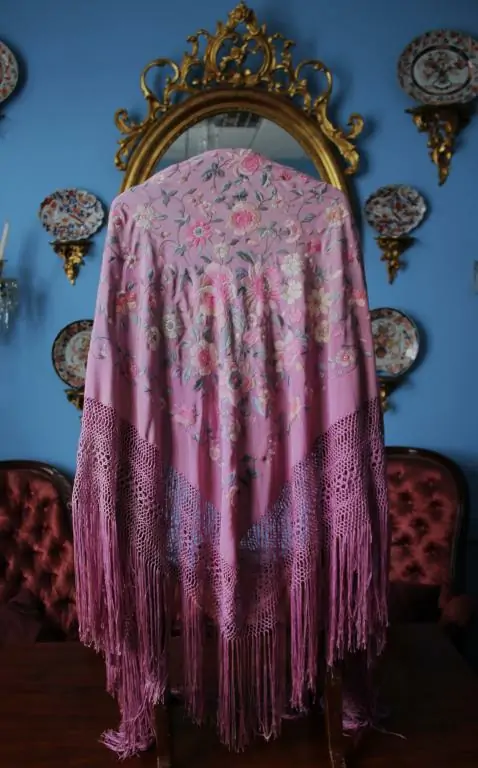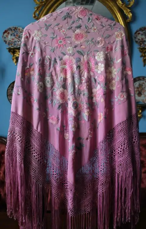 Magnifico mantón de Manila de finales del siglo XIX. Bordado sobre seda de color rosa palo.