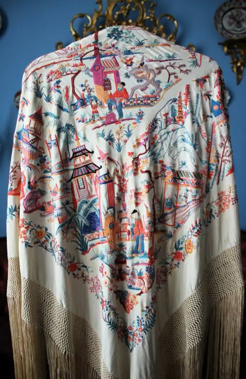 Maravilloso mantón de Manila antiguo Cantonés de la segunda mitad del siglo XIX. Bordado a mano en seda beige, bordado en colores donde predominan los azules. los naranjas, los verdes, los ocres, los malvas, los lilas, los turquesa, los corales, los blancos, y los marrones. Motivos de Chinosseries, con puentes, pagodas, escenas populares, terrazas, flores, aves, mariposas, teniendo en sus esquinas escenas cortesanas chinas con personajes, todo con un vibrante colorido.