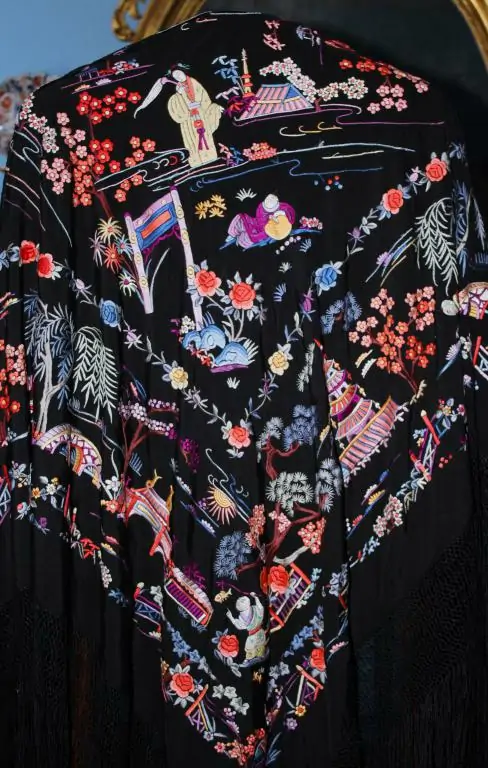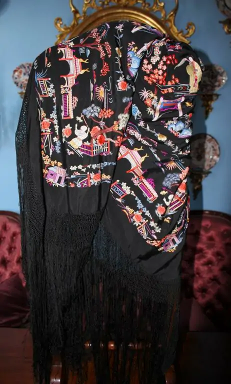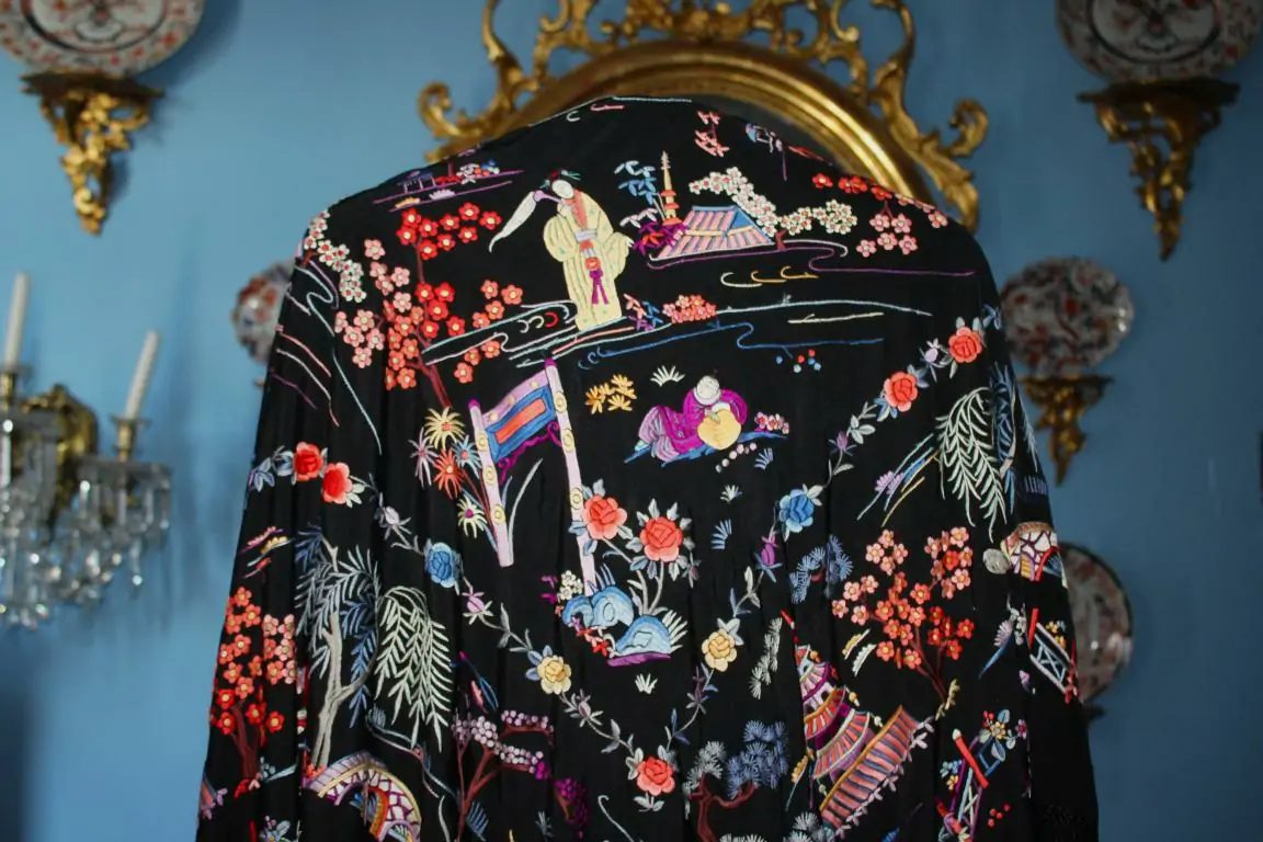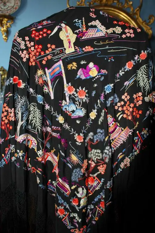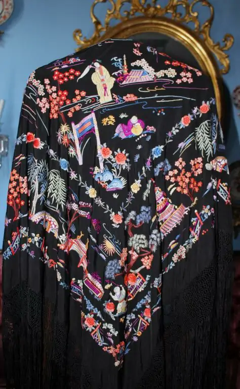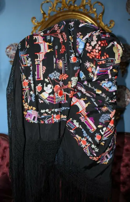Espectacular Mantón de Manila Cantonés de escenas de Chinoseries, de finales del siglo XIX o principios del siglo XX. Bordado en seda a mano en colores sobre fondo de seda negra. Predominan los azules, grises, malvas blancos, beiges, amarillos y naranjas. Bordado muy tupido, con puntadas apretadas. Se encuentra en excelente y magnífico estado de conservación. Maravilloso y muy elegante. Buen fleco de seda anudado a mano. Es un mantón muy peculiar por el diseño y por el colorido.