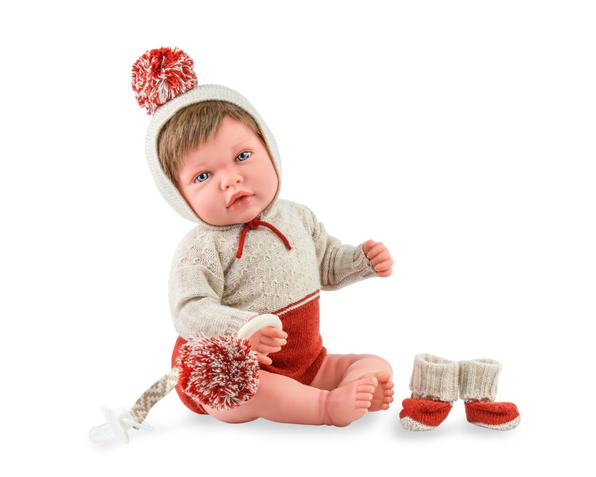 Uno de los elementos más llamativos de esta muñeca es su bonito gorrito de punto con pompón en tonos rojos y beige, que aporta un toque especialmente adorable al conjunto. Este accesorio completa el look de la muñeca y contribuye a reforzar su apariencia de bebé real.
