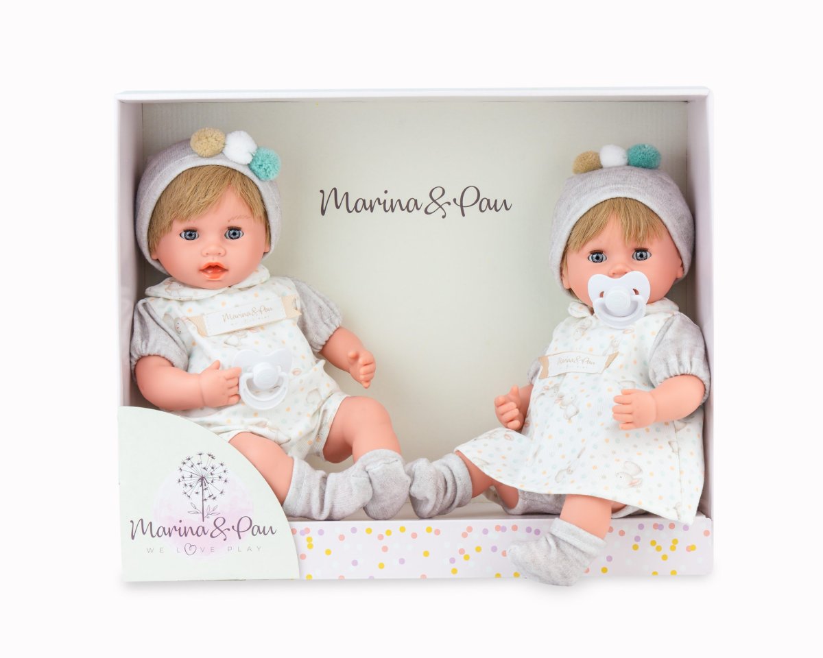 | Pareja de mellizos bebé reborn de 35 cm totalmente fabricados en España con materiales de gran calidad y detalle realista como el peso (850 kg. aprox. cada uno). Van vestidos iguales, la niña con vestido y el niño con pelele, patucos y gorritos a juego. Abren y cierran los ojos. Incluye certificado de nacimiento. Vienen presentados en un bonito estuche. Recomendada para mayores de 3 años. |