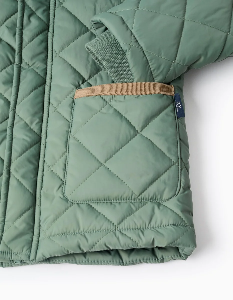 Parka acolchada verde oscura para niño con capucha desmontable. Bolsillos delanteros. Detalles de pana marrón en el cuello y los bolsillos para un toque más clásico. Cierre de cremallera y botones automáticos para vestirla fácilmente. Puños interiores de canalé para un ajuste perfecto. Etiqueta interior para el nombre del niño. We Care: esta prenda está rellena de poliéster reciclado. El abrigo ideal para los meses de invierno.