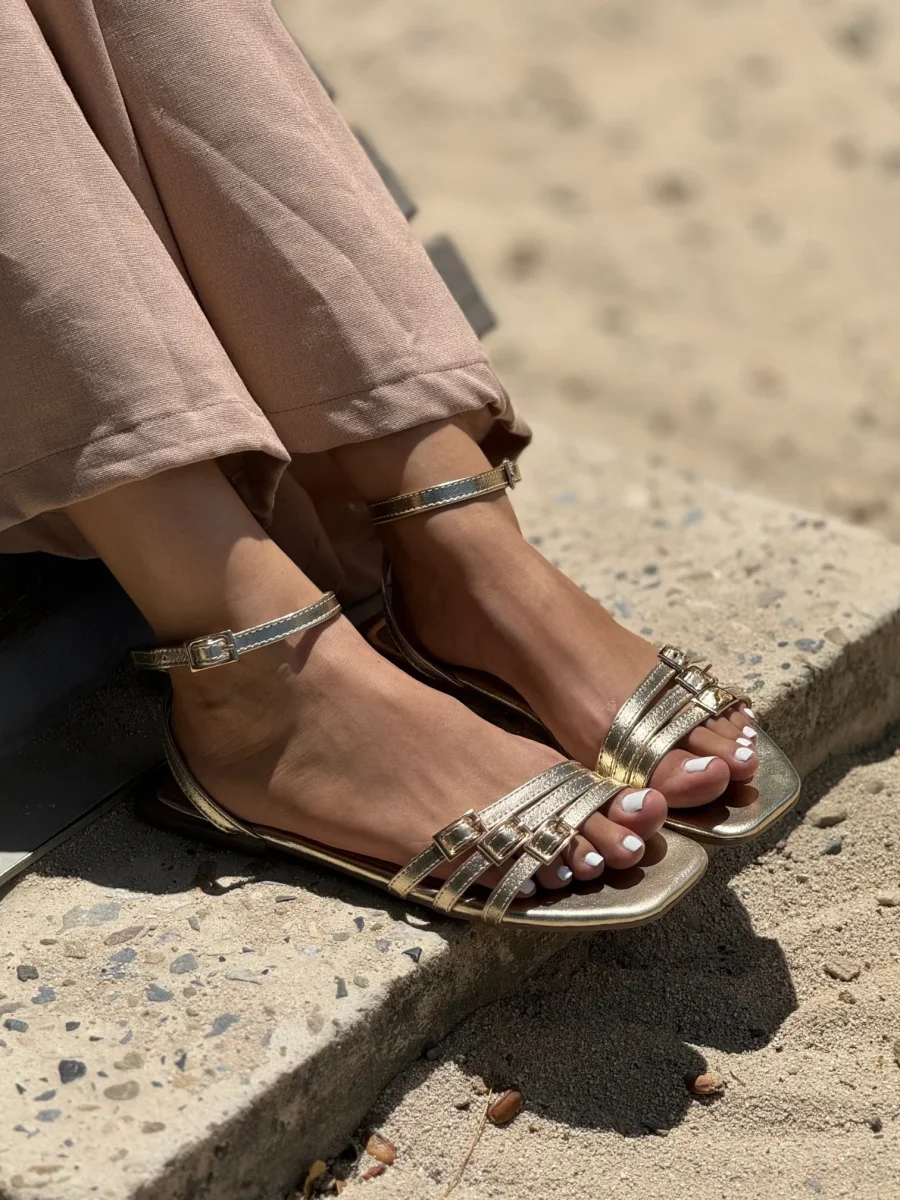Sandalias elegantes y modernas con tres tiras delicadas y amarre al tobillo, diseñadas para brindar un ajuste seguro y un estilo chic. Perfectas para looks casuales o para ocasiones donde quieras destacar con un calzado cómodo y sofisticado.
