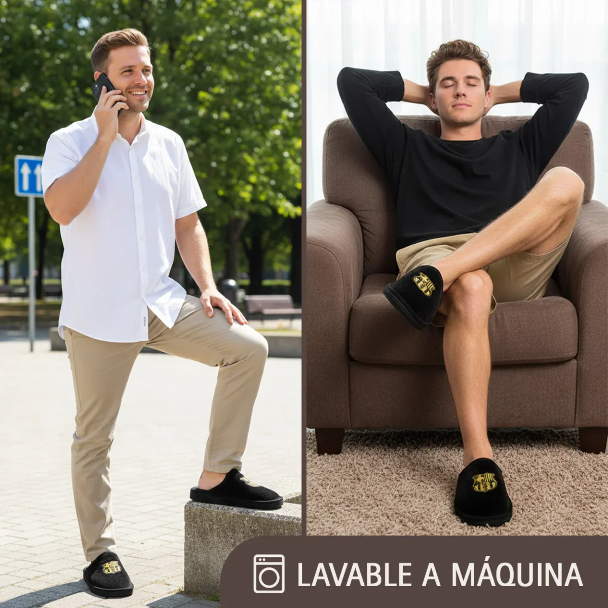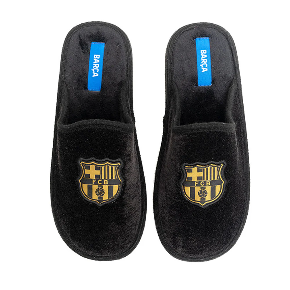 Zapatillas FC Barcelona para estar por casa con diseño liso en color negro para toda la familia, hombre, mujer y niño. Tejido suave y escudo grande estampado en la pala. Ideales para los más forofos.