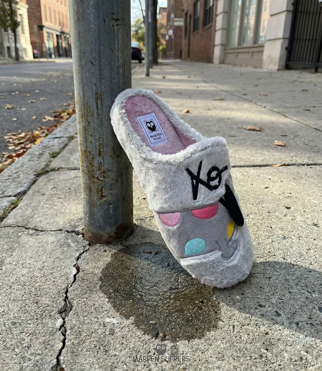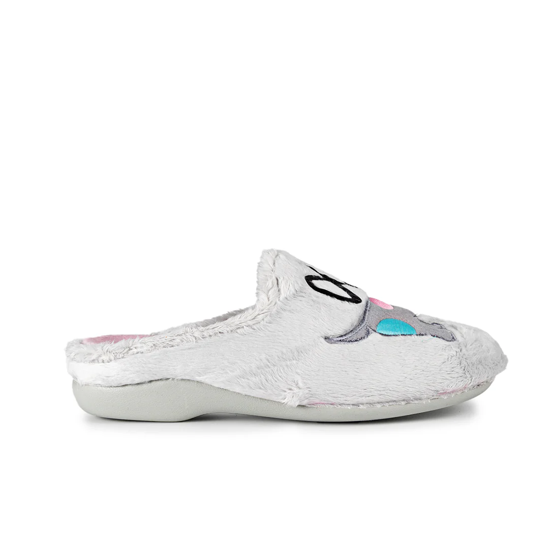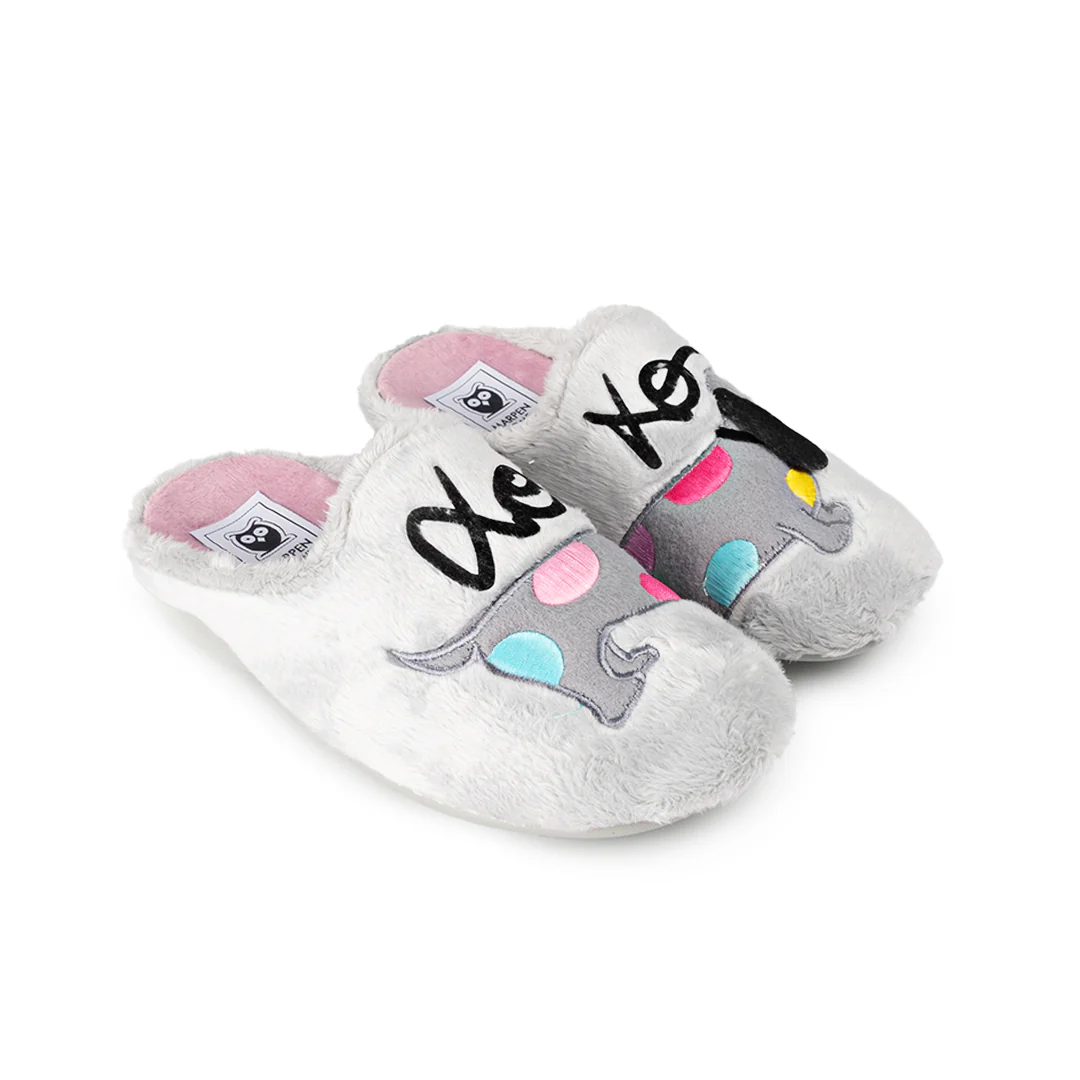 Zapatillas de andar por casa en gris suave con estampado de lunares y tierno perrito bordado que lanza un mensaje de amor: “XO XO”. Una caricia de ternura y estilo para tus pies.