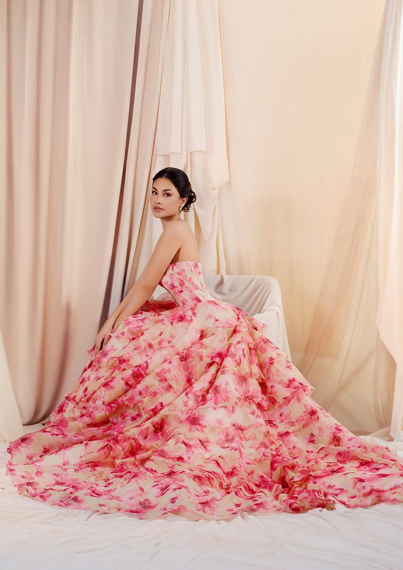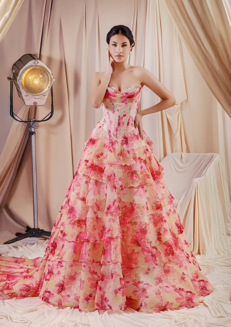 Vivien es una obra de alta costura que combina dramatismo, romanticismo y una ejecución impecable. Su estampado floral exclusivo aporta carácter y frescura, mientras el corsé entallado realza la figura con equilibrio y firmeza. La falda de gran volumen, construida en capas ligeras de organza, crea una silueta impactante que cobra vida con cada movimiento. El diseño se completa con detalles cuidadosamente colocados que aportan profundidad y personalidad. Pensado para novias que buscan algo único, sin miedo a soñar en grande. Como su musa, Vivien Leigh, este vestido está hecho para el centro del escenario: inolvidable, intenso y absolutamente protagonista.