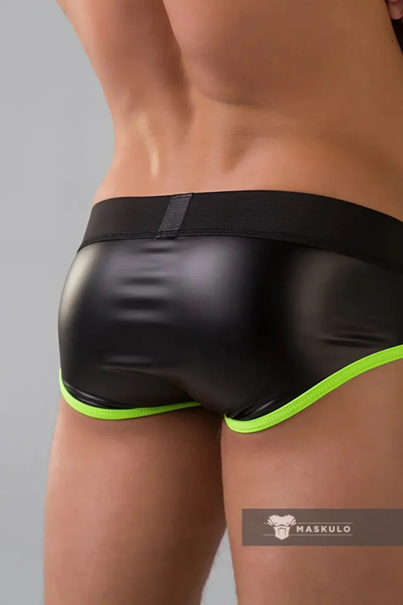 - Athletic-Fetish Hybrid: Combining a structured leather-looking fabric with performance spandex, these briefs establish a mood of vibrant confidence, energy, and modern style.